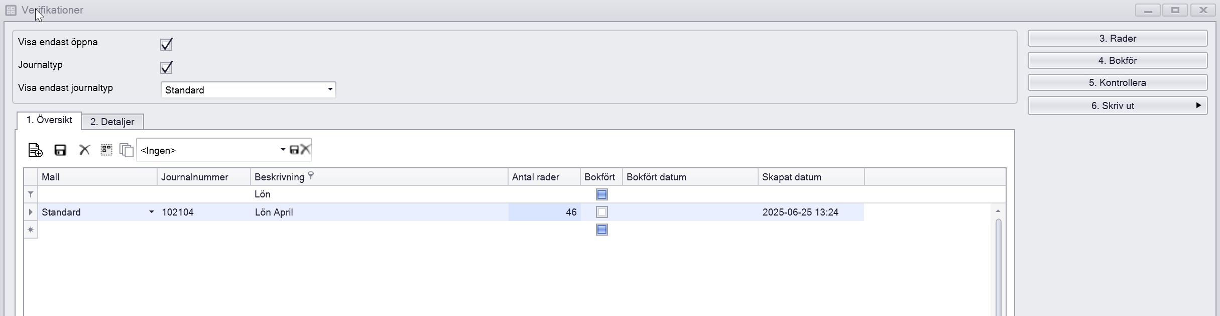 När den är sparad kan du öppna Bokföring / Verifikationer och välja att bokföra journalen du sparat.