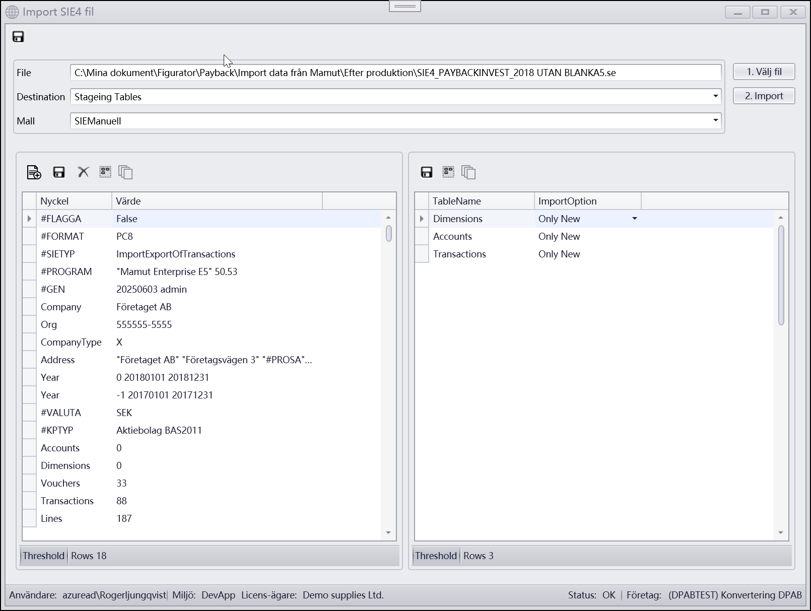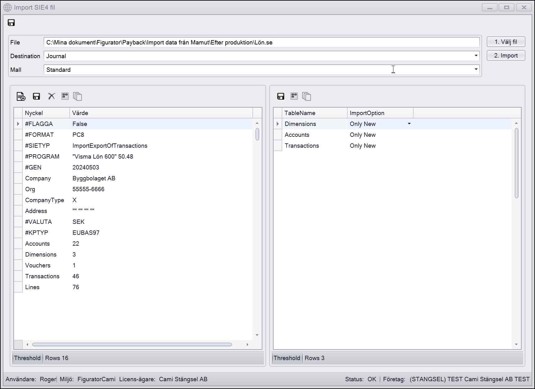 I detta fall har vi valt Stageing tables och en nummerserie som är manuell (du kan ändra det själv) vilket betyder att körningen använder sig av verifikatnummer som finns i SIE-filen.