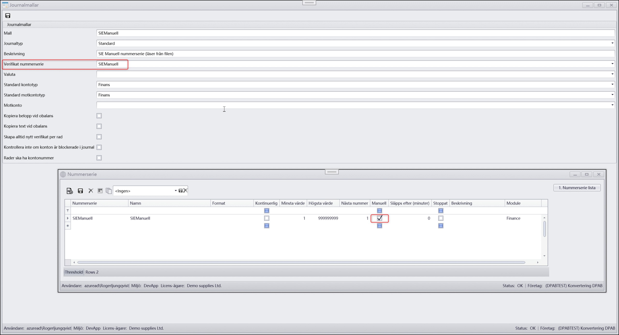 Väljer du en nummerserie som inte är manuell så styr nummerserien hur verifikatnummer sätts.