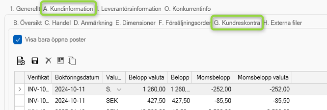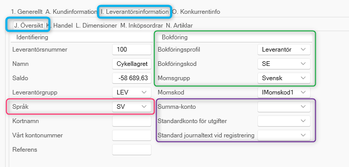 Det som gäller specifikt kund och leverantör finns under dessa respektive flikar.