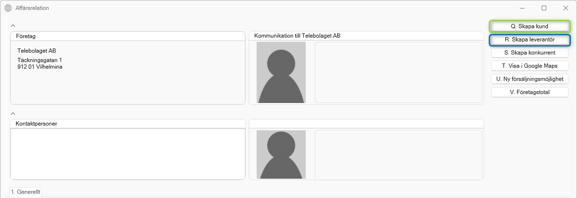 För att skapa en kund eller leverantör från en befintlig affärsrelation så trycker man på knappen för ”Skapa kund” eller ”Skapa leverantör”.