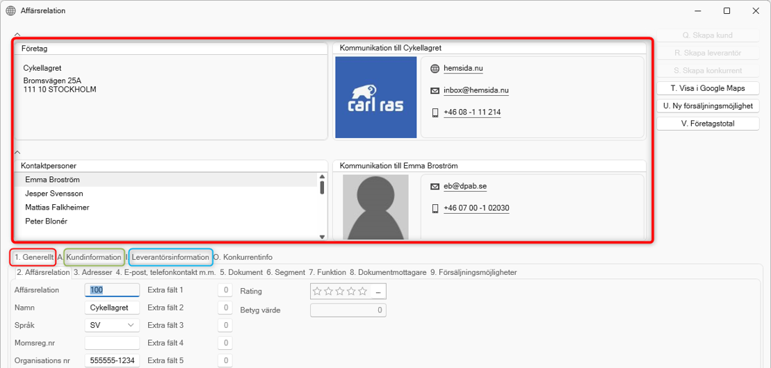 Fliken Generellt avser affärsrelationen och innehåller bl.a. orgnr, leveransadresser, distributionssätt olika dokument, epost, dokument och inlägg.