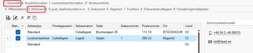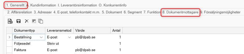 Fliken Generellt avser affärsrelationen och innehåller bl.a. orgnr, leveransadresser, distributionssätt olika dokument, epost, dokument och inlägg.