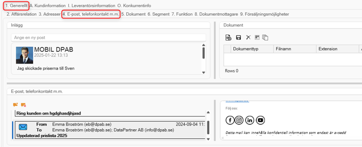 På fliken Epost, telefonkontakt m.m. så kan man lägga in mail till/från kunden, skriva inlägg och lägga till dokument som alla