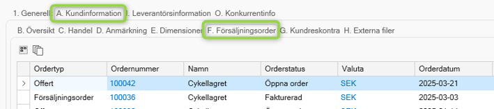 På fliken Försäljningsorder så ser man vilka orders som är gjorda på kunden och vilken orderstatus de har just nu: