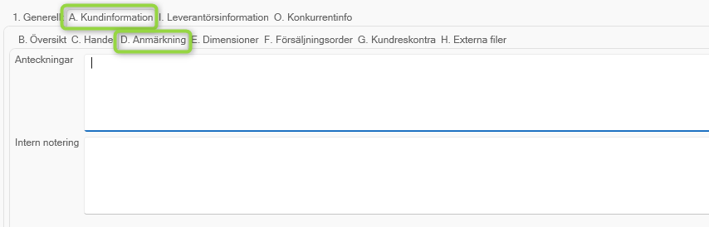 På fliken Anteckningar så kan man göra anteckningar som följer med in på en kundorder:
