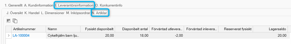 På fliken Artiklar så ser man vilka artiklar som är kopplade till leverantören: