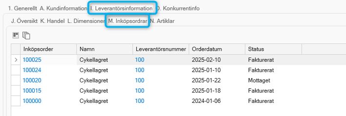 På fliken Inköpsordrar så ser man vilka orders som är gjorda på leverantören och vilken orderstatus de har just nu: