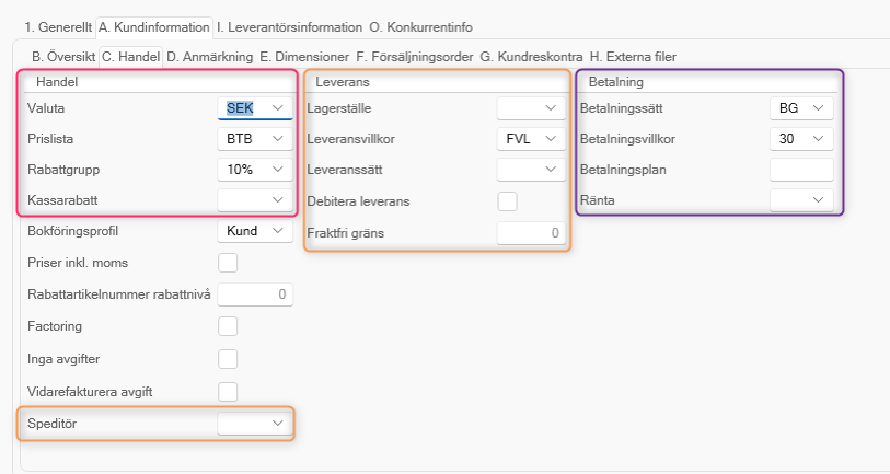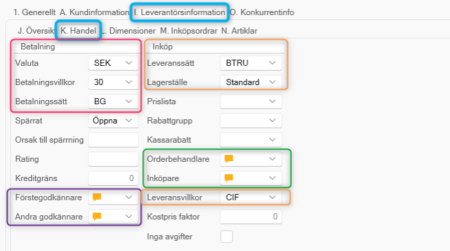 På fliken Handel så hittar man de, för er och leverantören, viktiga inställningarna så som: