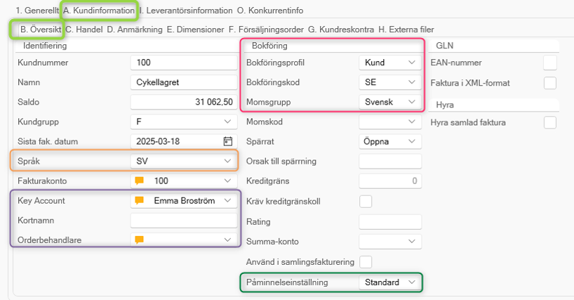Det som gäller specifikt kund och leverantör finns under dessa respektive flikar.