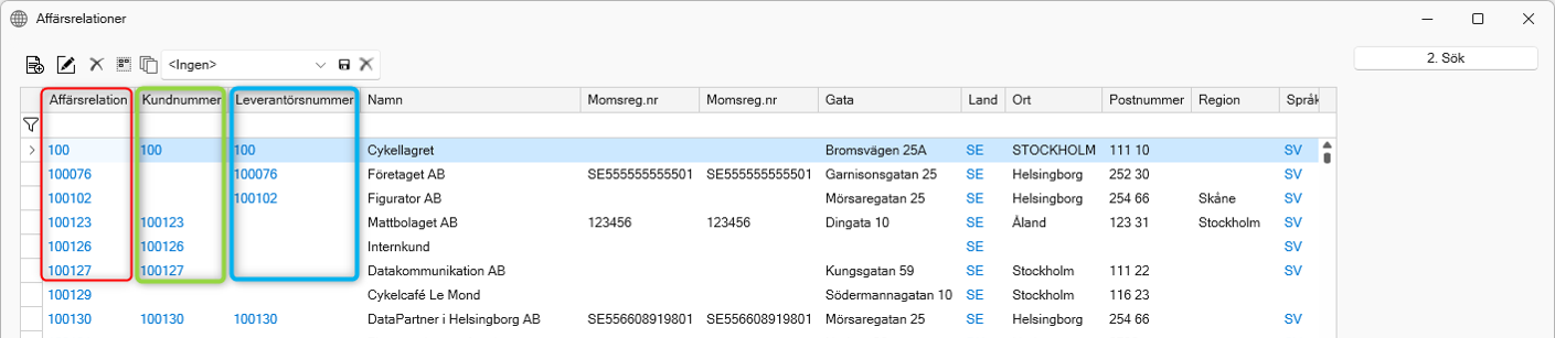 I listan över affärsrelationer kan man se om den är en kund, leverantör eller inget av det, i kolumnerna för kundnummer och leverantörsnummer. Tomt i båda dessa innebär att de endast är en affärsrelation.