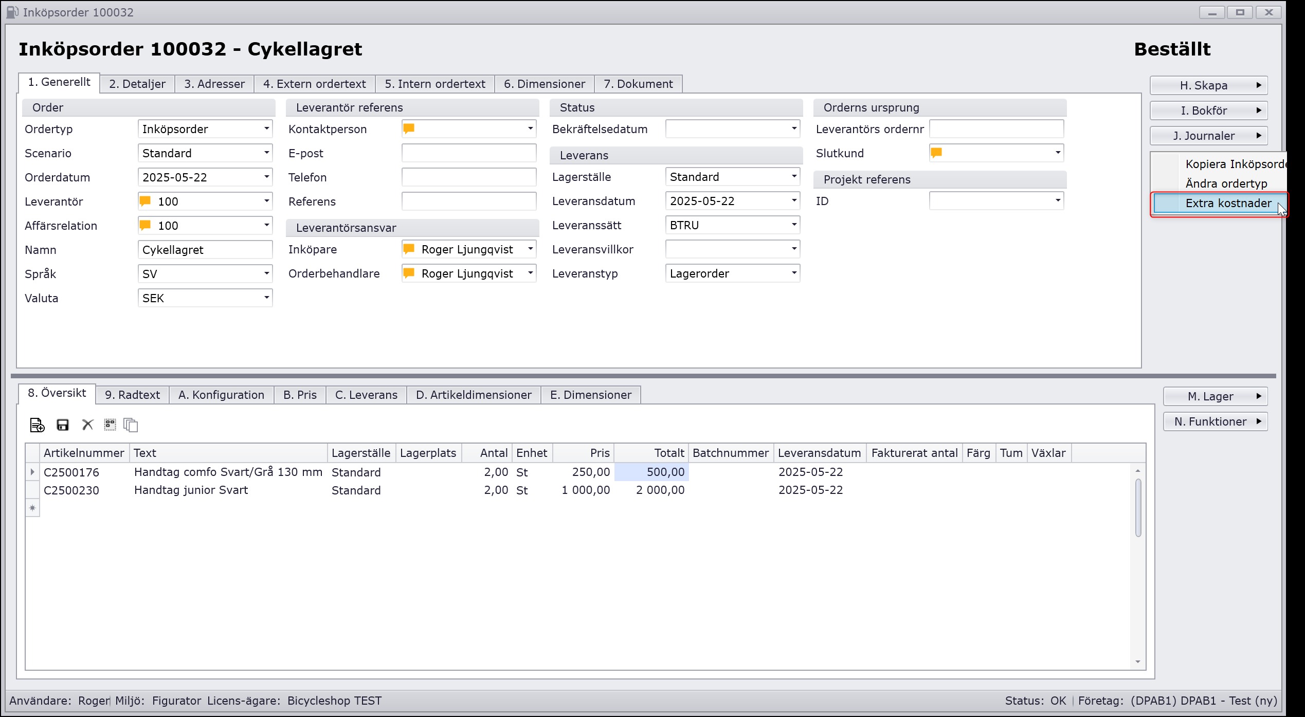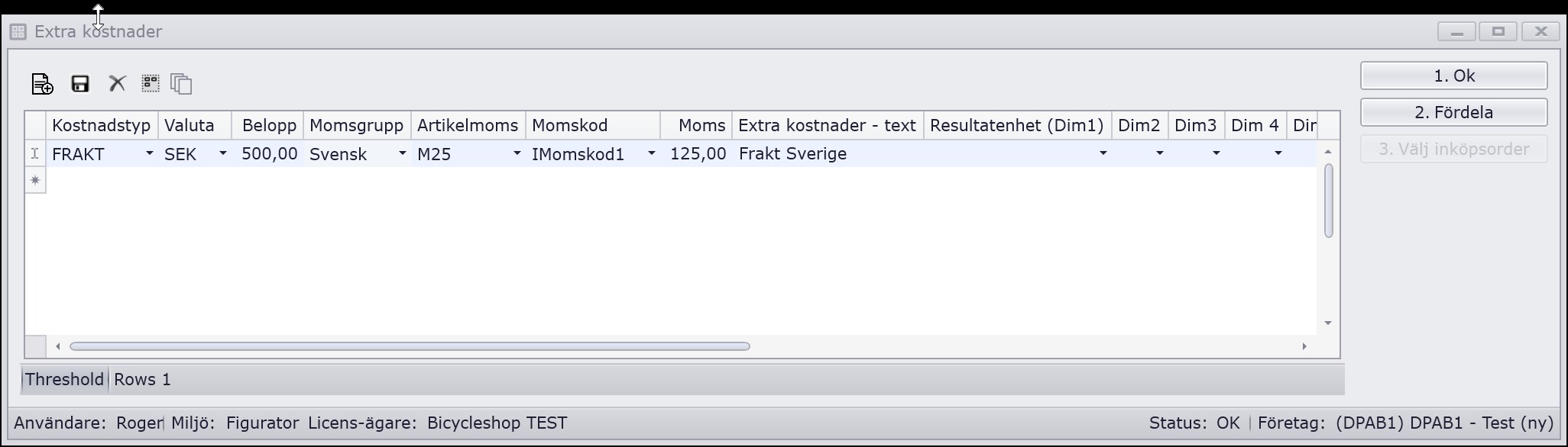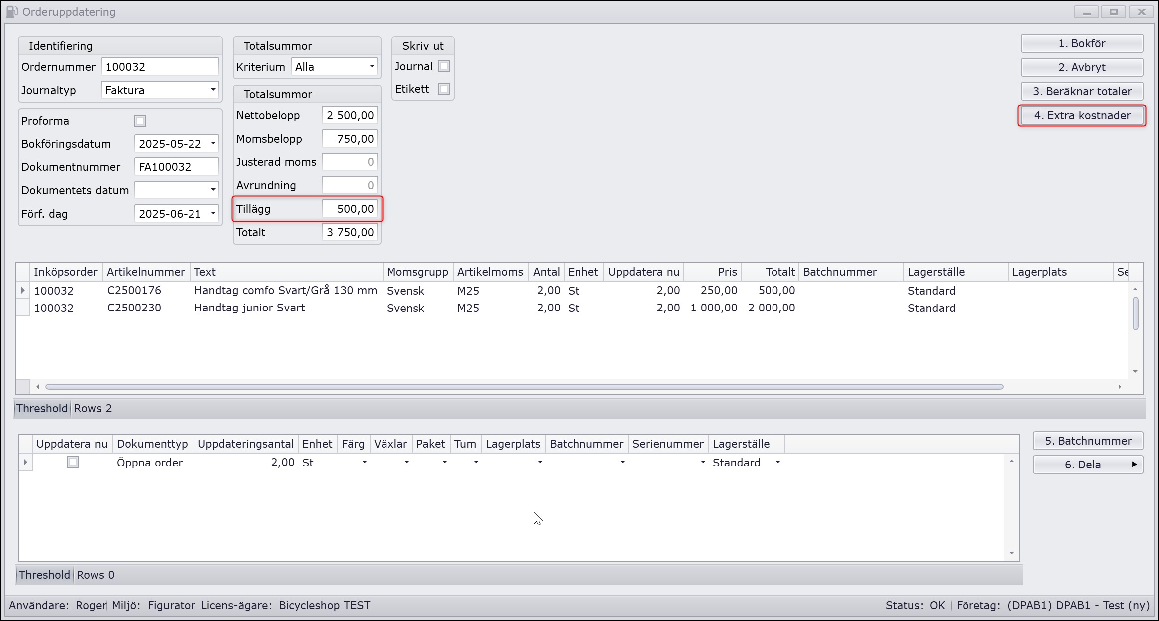 Extrakostnaderna bokförs när inköpsordern uppdateras (bokför faktura). De kan också ändras härifrån. Eventuell moms inkluderas i summorna som visas i Orderuppdatering.