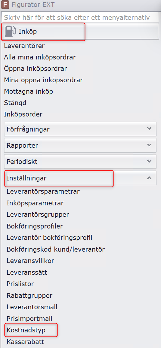 Du konfigurerar anskaffningskostnaderna under Inköp – Inställningar – Kostnadstyp.