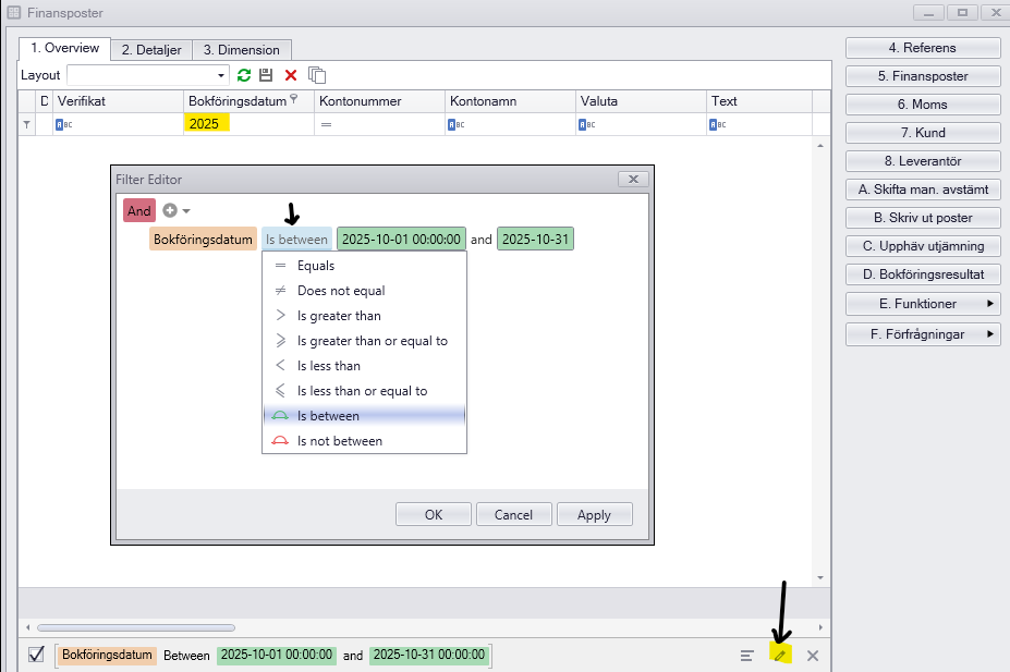 Ibland kan det vara enklare att bara skriva in datumspannet direkt i fältet med två punkter mellan datumen (vilket motsvarar “Between”), till exempel:2025-10-01..2025-10-31